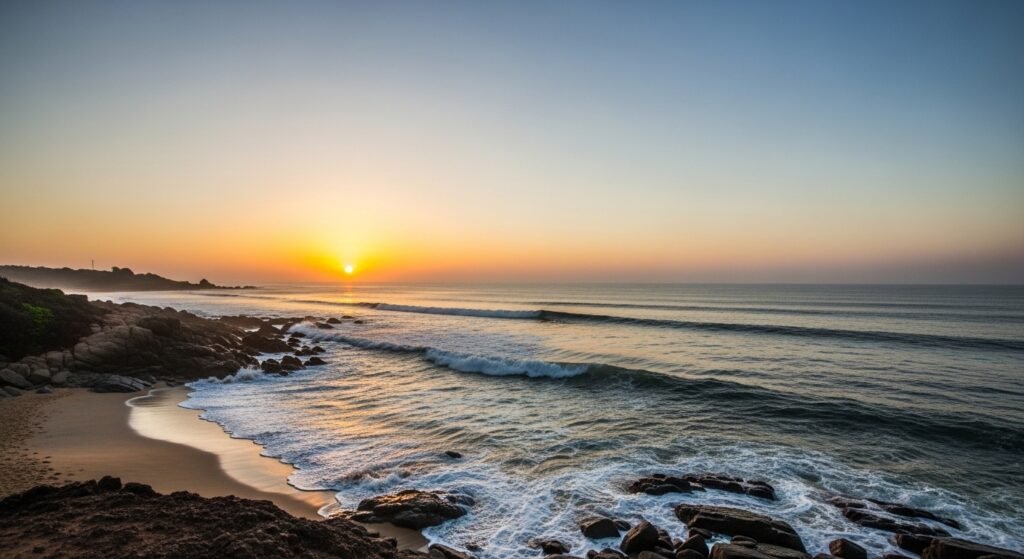 Rameswaram’s beaches are known for their calm, shallow waters and spiritual significance. The clear horizon and quiet surroundings create a meditative atmosphere that draws travelers seeking both beauty and reflection.