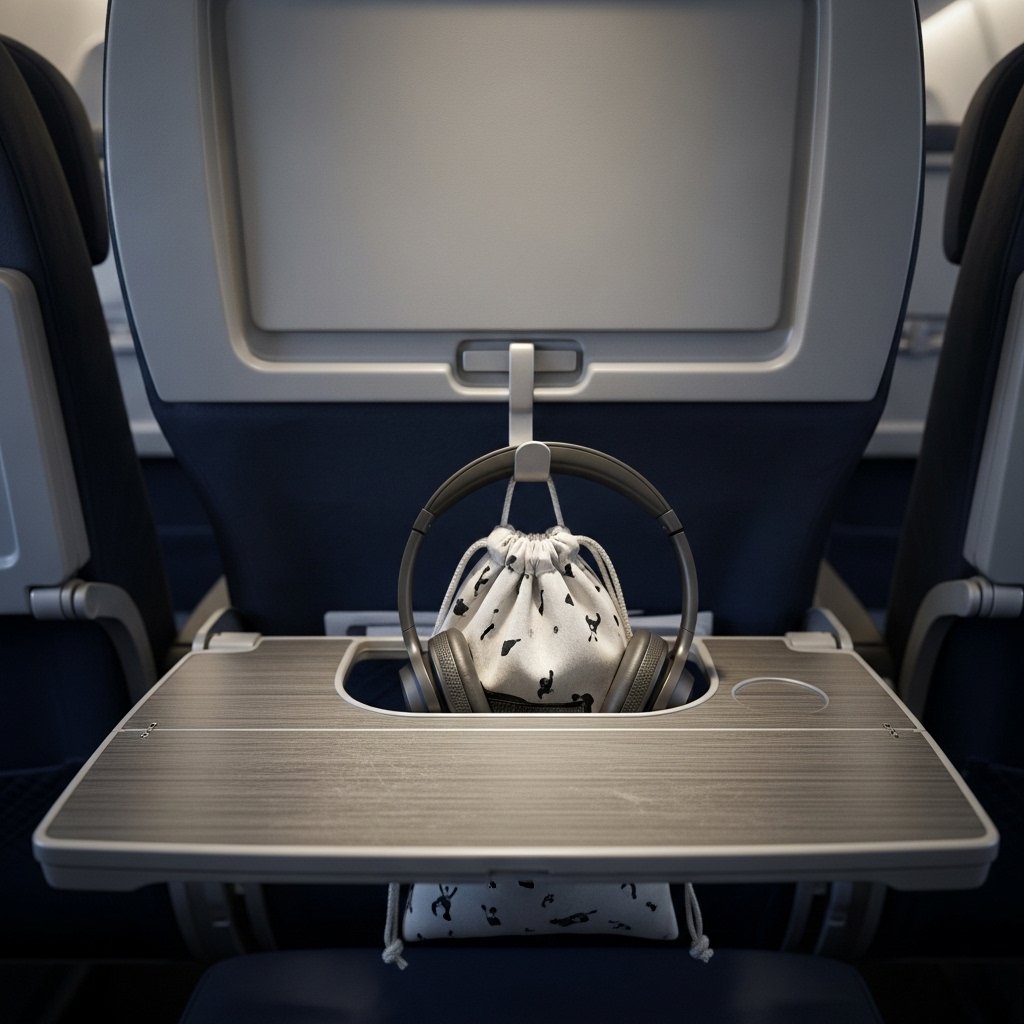Many tray tables include a small hook or notch on the front edge. Passengers can use this feature to suspend their lightweight bags and headphones which will then remain above the ground.