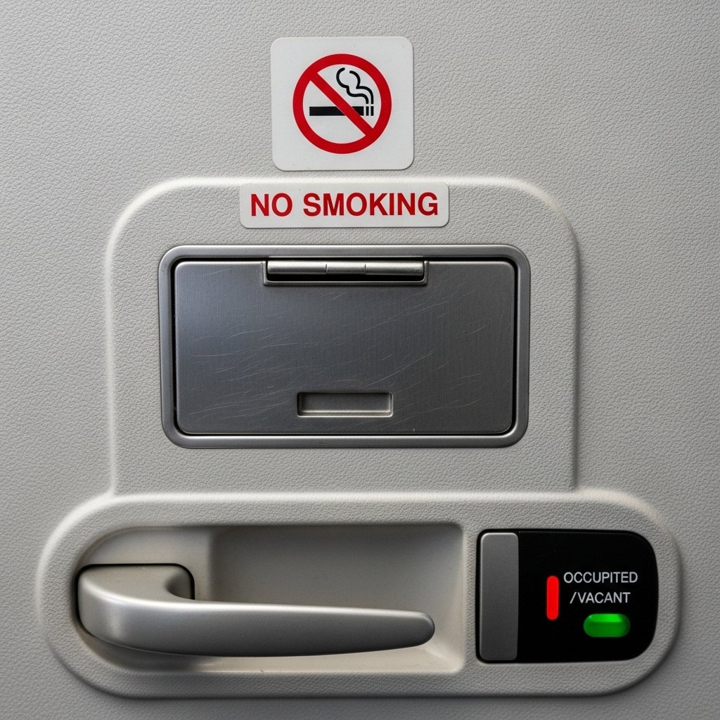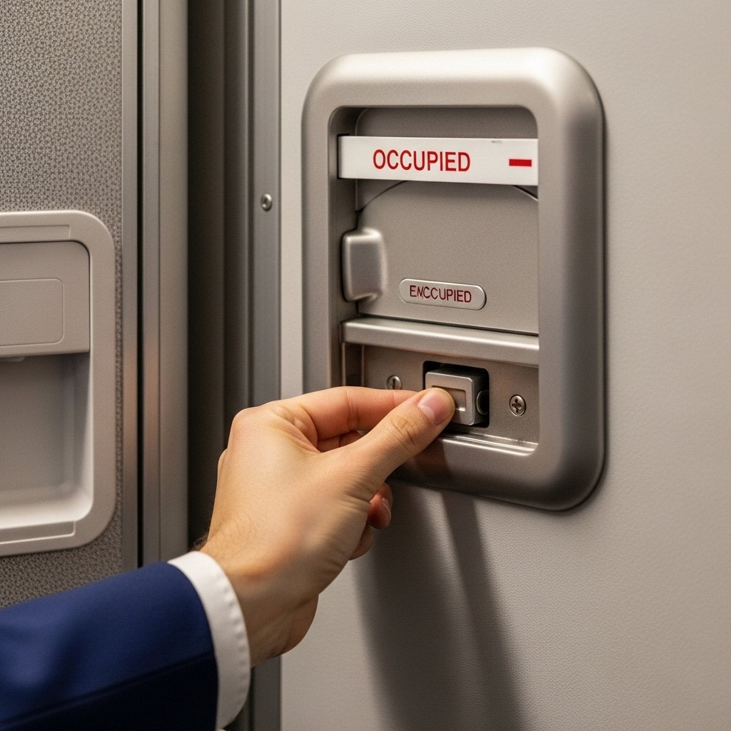 Airplane bathroom doors can be unlocked from the outside using a simple latch hidden behind the “occupied” sign. The system enables emergency access to lavatories for crew members.