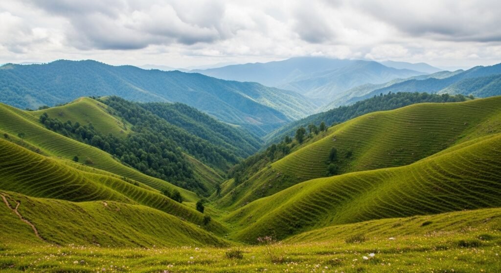 Dzukou Valley stretches through the Nagaland and Manipur border territory which features its undulating green hills and its seasonal wildflower displays. The region known as the Valley of Flowers of the Northeast attracts trekkers who seek to experience its mountain vistas and unspoiled natural environments.