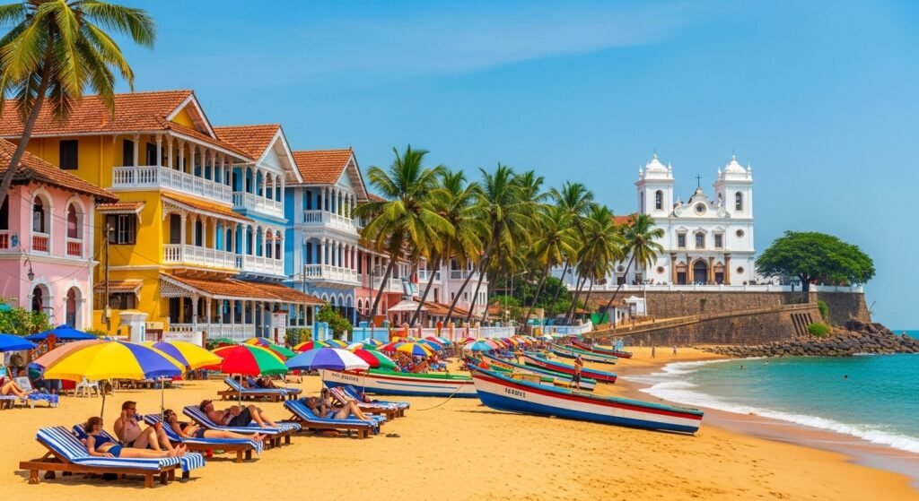 Goa showcases its Portuguese heritage through its beaches and vibrant homes and its churches which display Portuguese architectural styles. European beach destinations get their beachfront atmosphere from the combination of relaxed living and ocean vistas which travelers experience.