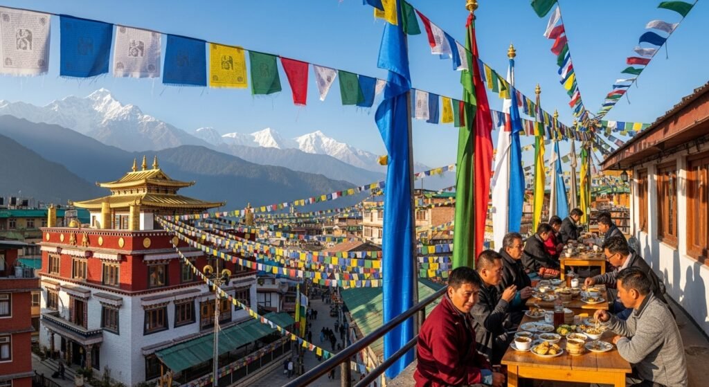 Tibetan culture dominates the atmosphere of McLeod Ganj. The installation creates a Tibetan atmosphere through its combination of monasteries and prayer flags and Tibetan cuisine. People who experience the area can enjoy both its tranquil atmosphere and its mountain scenery.