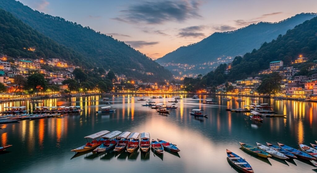 Nainital Lake lies between a lively town and surrounding hills. The lake exhibits its attractive features through its boating activities and the lights of the evening which create reflections on the water.