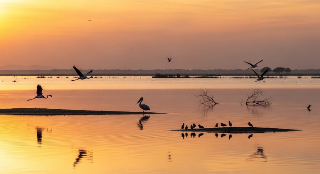 Chilika Lake stands as the largest coastal lagoon in India. The lagoon provides birdwatching opportunities and peaceful environments which become especially beautiful during the sunrise and sunset hours.