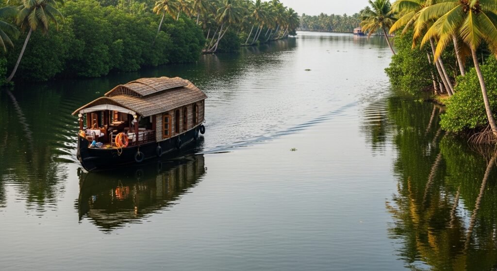 Vembanad Lake provides visitors with opportunities to take houseboat tours while they can also enjoy scenic views of the backwaters. The area creates a peaceful experience through its tranquil waters and lush green landscape.