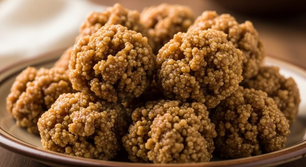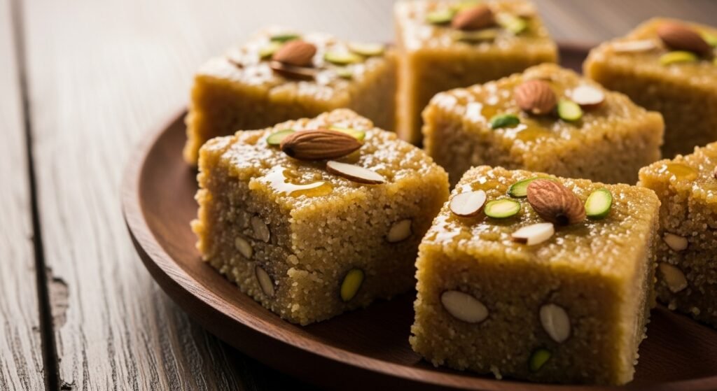 Originating from Khambhat, Halwasan is a dense sweet made from wheat, milk, and ghee. Its chewy texture and nutty flavor make it stand out among traditional Gujarati desserts.