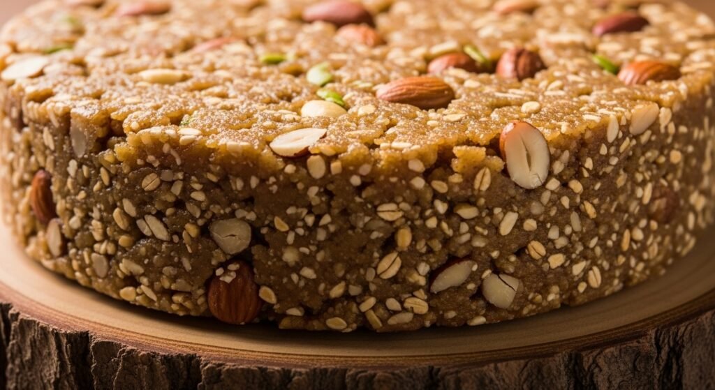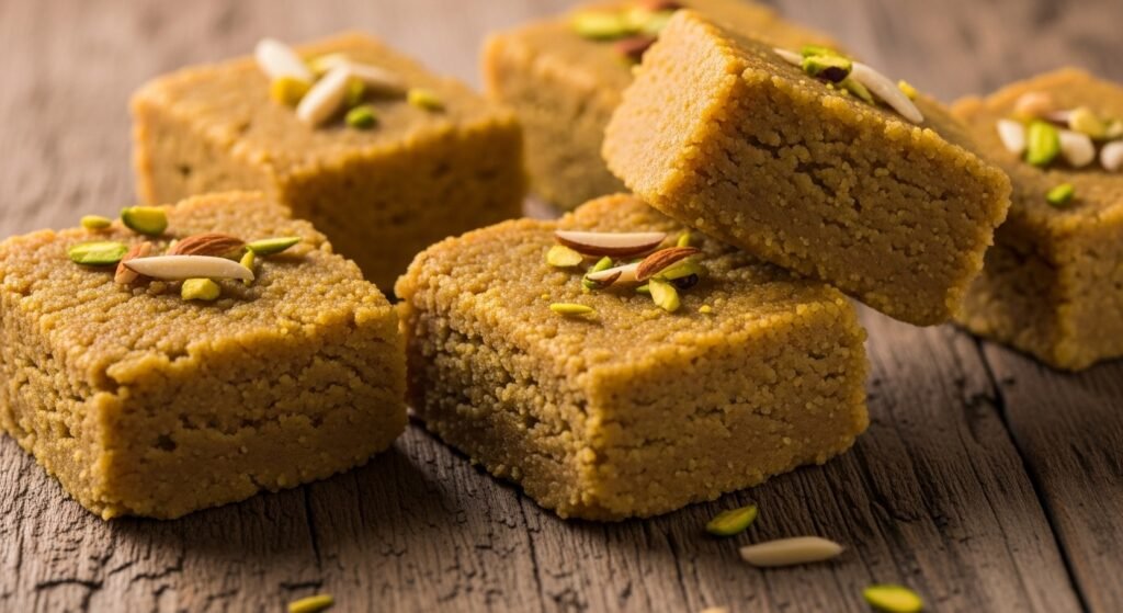 A rich gram flour sweet slow-cooked with ghee and sugar, Mohanthal has a slightly grainy texture and deep flavor. It is often flavored with cardamom and garnished with nuts for added richness.