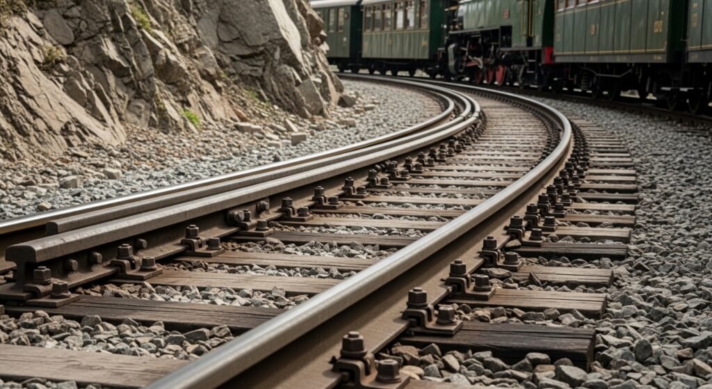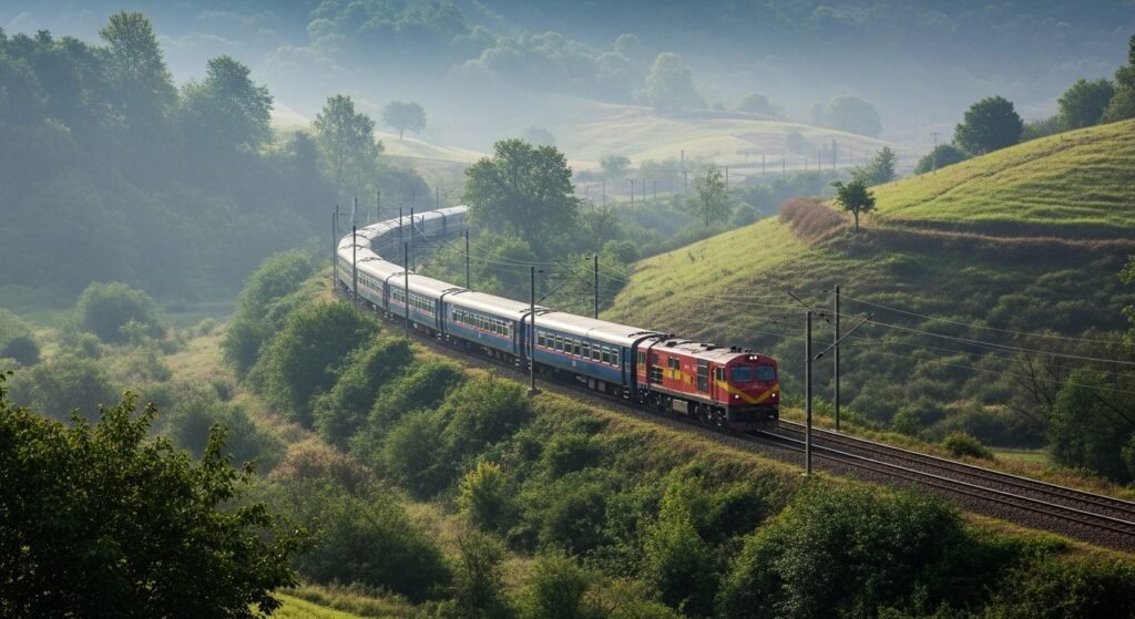 The train operates on narrow gauge tracks that enable it to traverse mountain bends. The trip becomes more attractive because of this design element which enhances the journey experience.