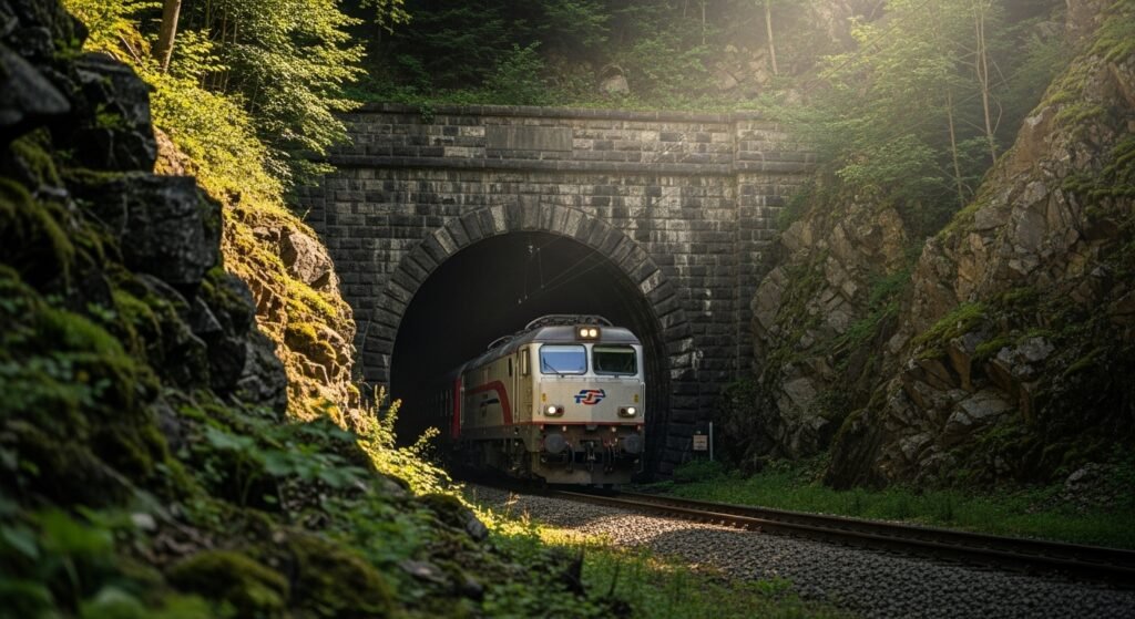 The route includes more than 100 tunnels and many small bridges. The train travels through the hills and valleys because these elements create a distinctive and enjoyable path for the journey.