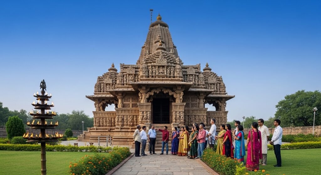 The temple structure consists of large stone blocks which architects used to create intricate decorative elements. The building design follows traditional Indian temple architectural styles which allow visitors to observe ancient design techniques.