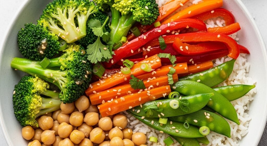 Layer boiled chana over steamed rice with sautéed vegetables and yogurt dressing. This bowl is customizable and balanced, combining protein, carbs, and healthy fats. It is ideal for meal prep and helps maintain steady energy levels throughout the day.