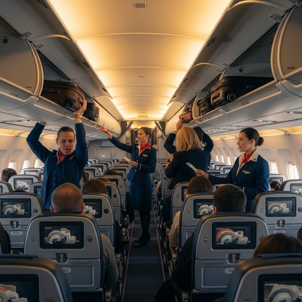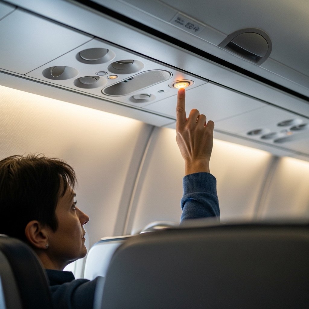 A chime sound alerts flight attendants when a passenger uses the call button which they find above their seat. This assists crew members in quickly attending to passenger needs.