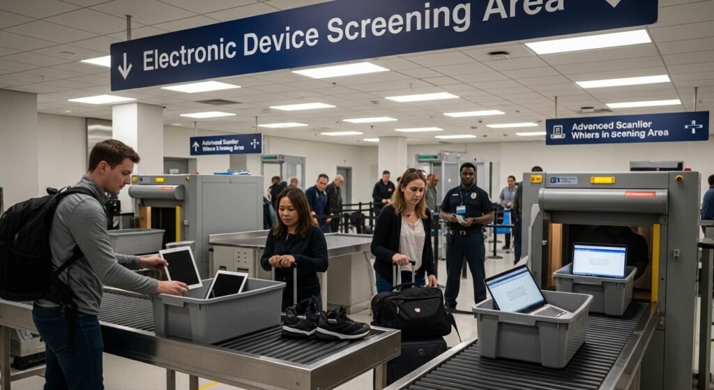 Travelers need to undergo extra screening for their larger electronic devices which include laptops and tablets that require separate screening from standard lanes. Some airports with advanced scanners allow items to remain in bags.