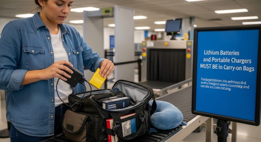 Air travelers must pack their lithium battery packs and portable chargers into their carry-on bags because fire safety regulations prohibit checked baggage delivery. The regulations do not allow checked baggage for these items because they need to remain in carry-on luggage.